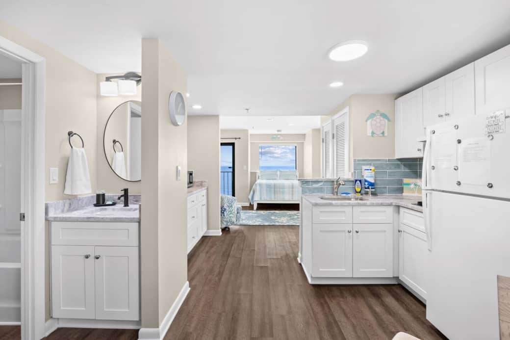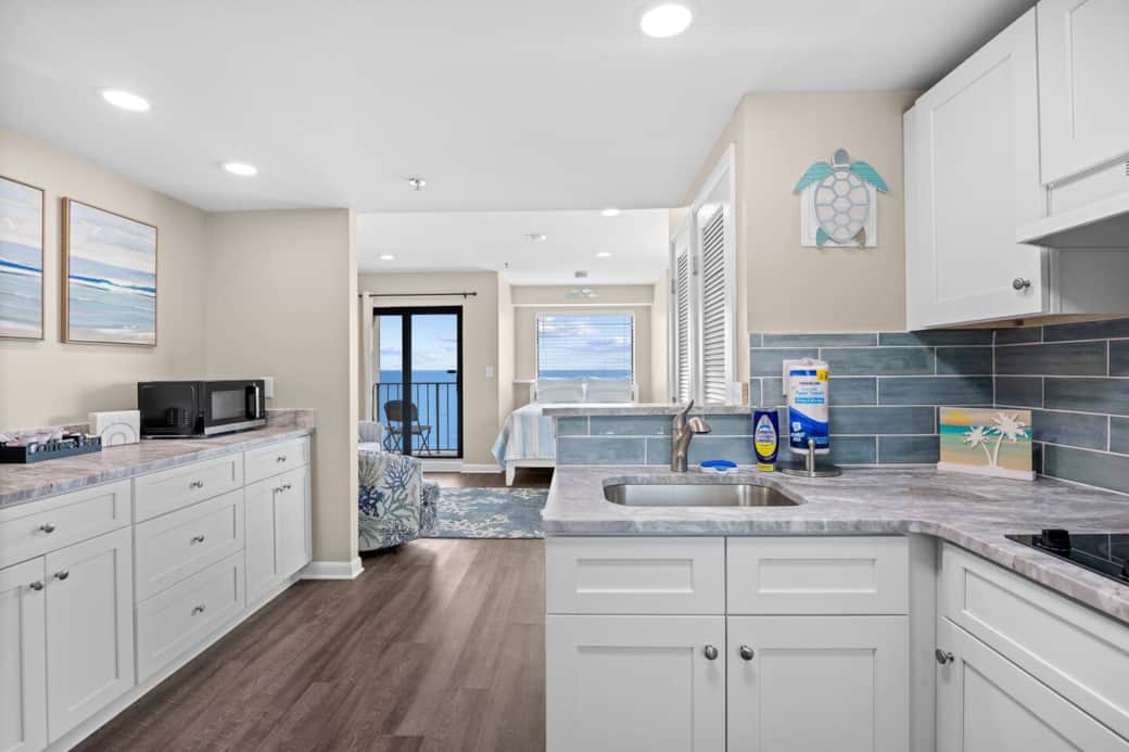 Largest end studio in the tower, direct ocean front with private balcony, all windows have ocean views, kitchen has stove cook top, refrigerator/freezer with ice, all in one microwave that bakes, toasts, and airfrys, keurig coffee maker, full bathroom with tub, Queen bed and Queen pull out couch. Linens/towels provided. Complimentary supplies include : face/body soap, shampoo/conditioner, make up wipes, blowdryer, coffee/tea, creamer, sugar.