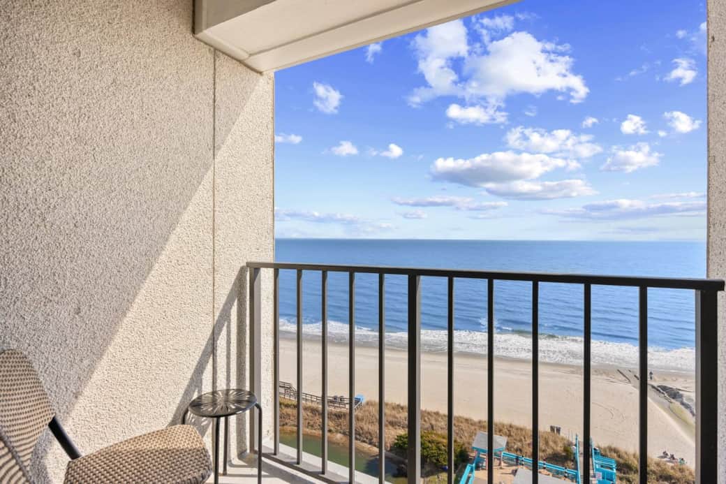 Largest end unit studio in the Renaissance Tower located in the Myrtle Beach Resort, Direct Ocean Front. Front and side direct ocean views, Private Balcony, Beautifully remodeled in 2026-all new, Sleeps 4, Queen Bed and Queen pull out couch, Fresh linens and towels provided, Ocean front cabana bar restaurant, 6 pools, Hot tub, Sauna, Lazy river, Poolside snack bar, Fitness room & so many more amenities to enjoy on this entire 33 acre beach resort.